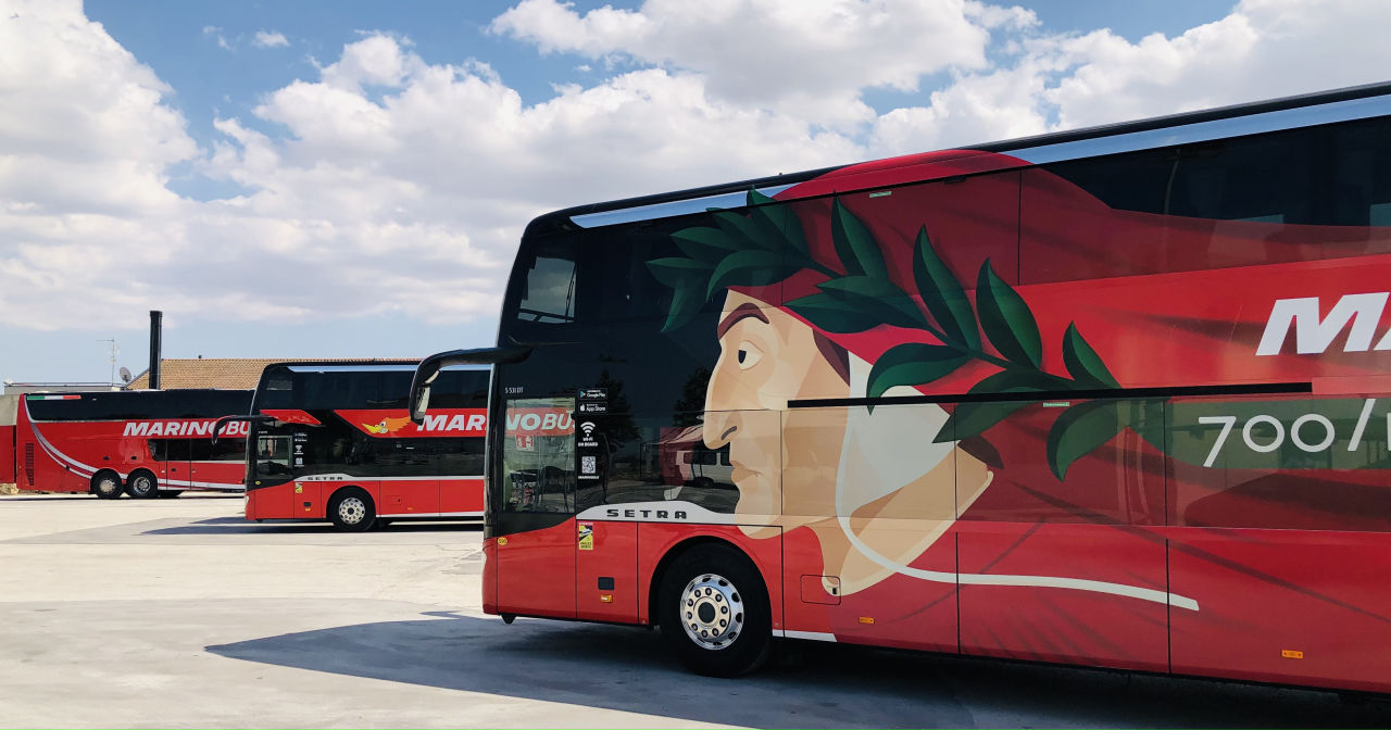 MarinoBus ha deciso di fare la sua parte per le celebrazioni del settecentenario dalla morte di Dante Alighieri con due pullman esteticamente rivisitati: una nuova livrea dominata dal celebre profilo del Sommo Poeta caratterizzerà gli esterni; all’interno, invece, saranno riprodotti alcuni dei più famosi versi della Commedia.