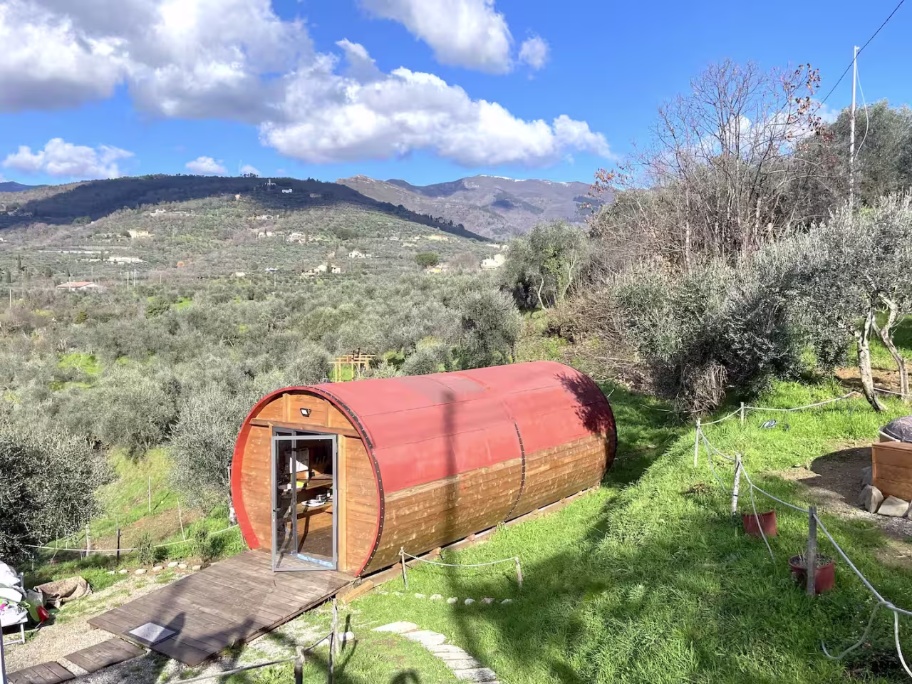 La struttura selezionata è Le Botti Fiorentine, situata a Regello, e offre un'esperienza unica di soggiorno all'interno di una botte abitativa interamente realizzata in legno. Al suo interno vi aspettano un ambiente climatizzato con una cucina completamente attrezzata, un bagno privato con doccia e set di cortesia.