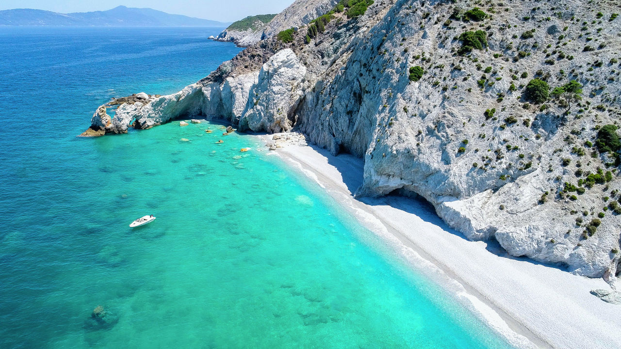 Skiathos è un'isola greca situata nel Mar Egeo settentrionale, celebre per le sue splendide spiagge di sabbia bianca e le acque cristalline. Il paesaggio è caratterizzato da colline ricoperte di pinete, che offrono un contrasto mozzafiato con il blu intenso del mare.